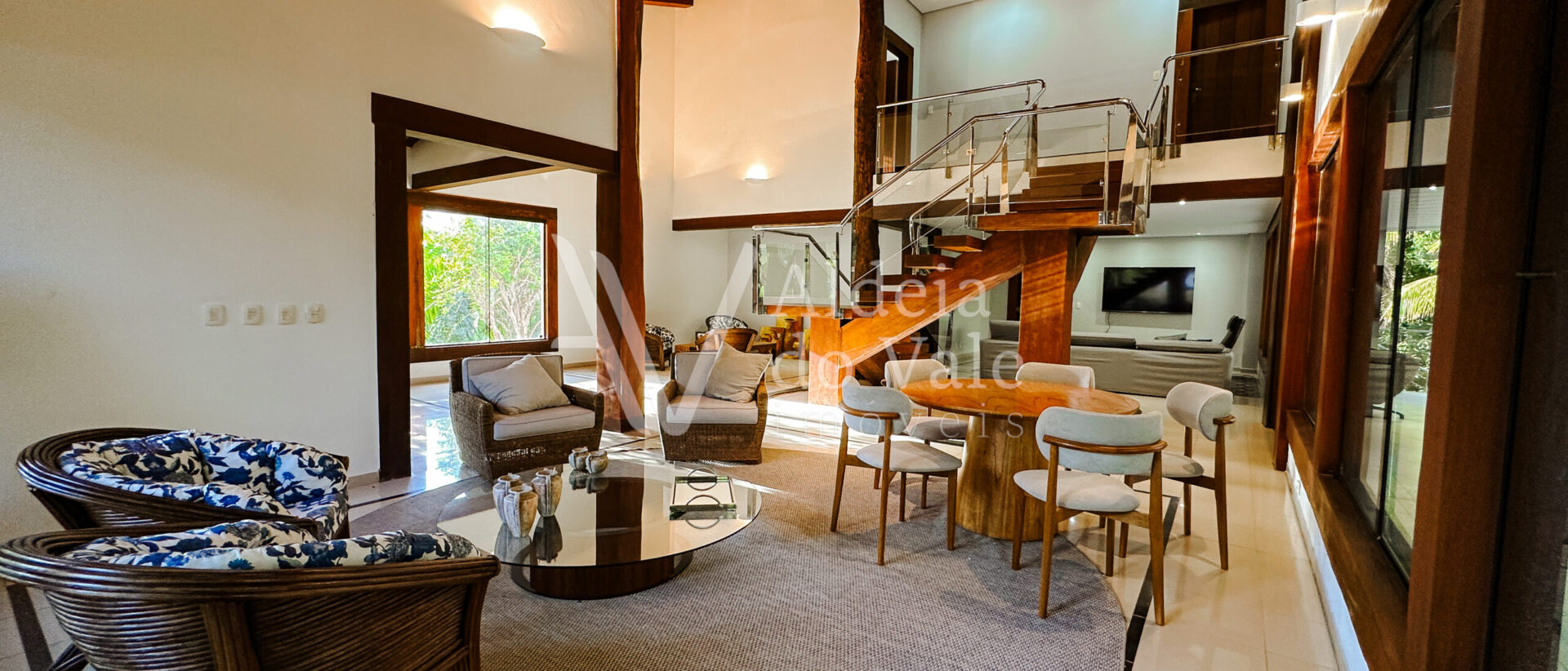 Com madeira, no estilo rústico, super aconchegante, possui uma sala lindíssima, muito bem iluminada, com pé-direito duplo.