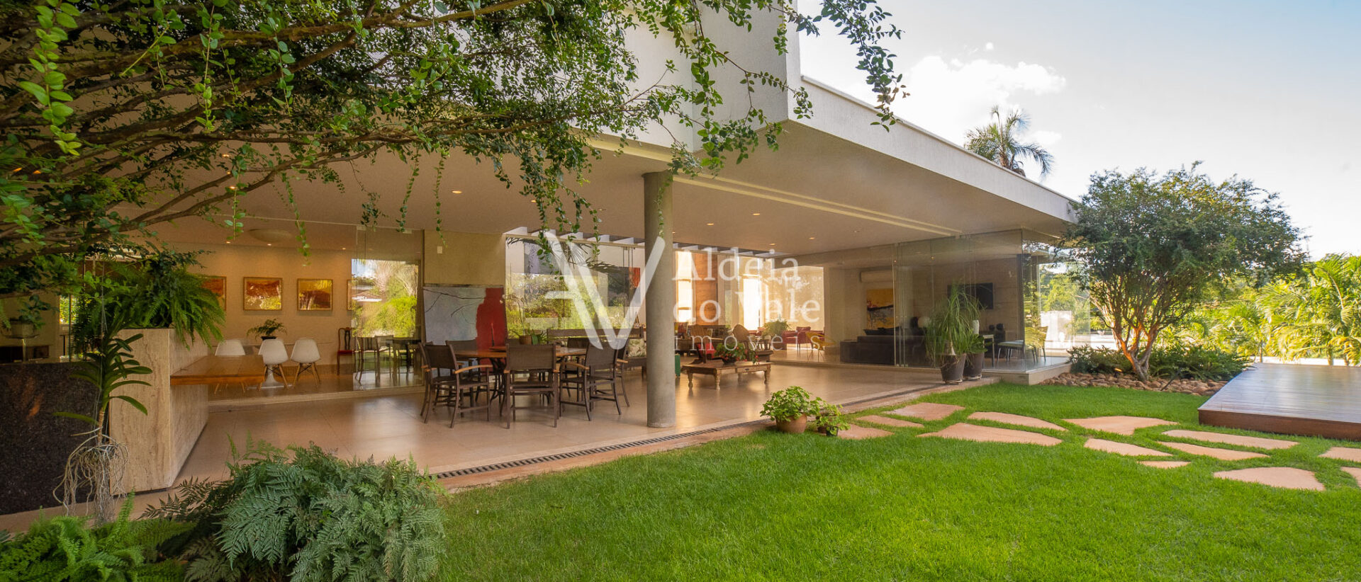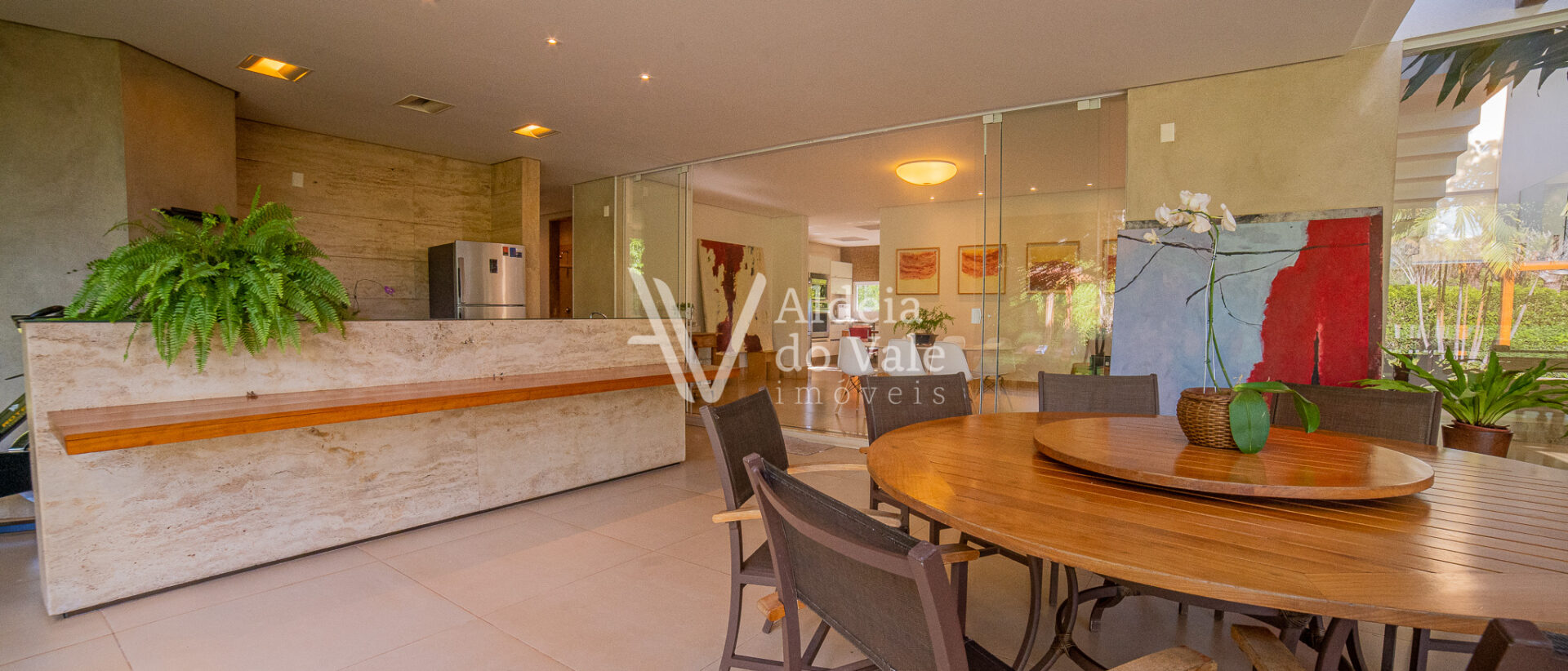 Adentro na suavidade do ambiente tão iluminado pela luz do sol, a qual adentra pela transparência das amplas folhas de vidro. Avisto um quadro verde de relevo e profundidade, por todos os ângulos que a vista alcança é uma beleza perfeita nos tons da natureza disposta de forma harmoniosa pela paisagista Fernanda Simões com os inúmeros açaís, jaboticabas, palmeiras macarthurii, ipês branco, rosa e amarelo.