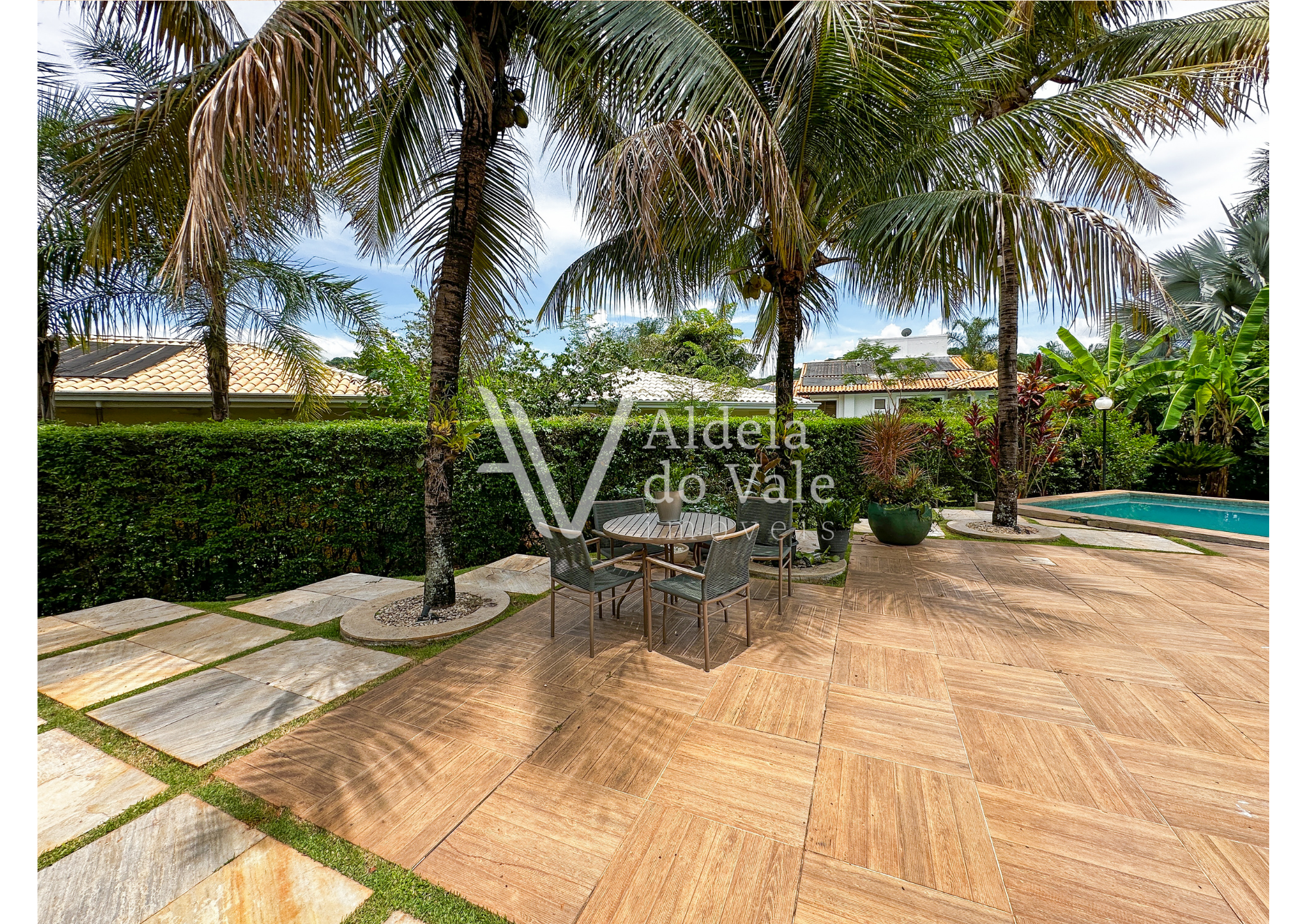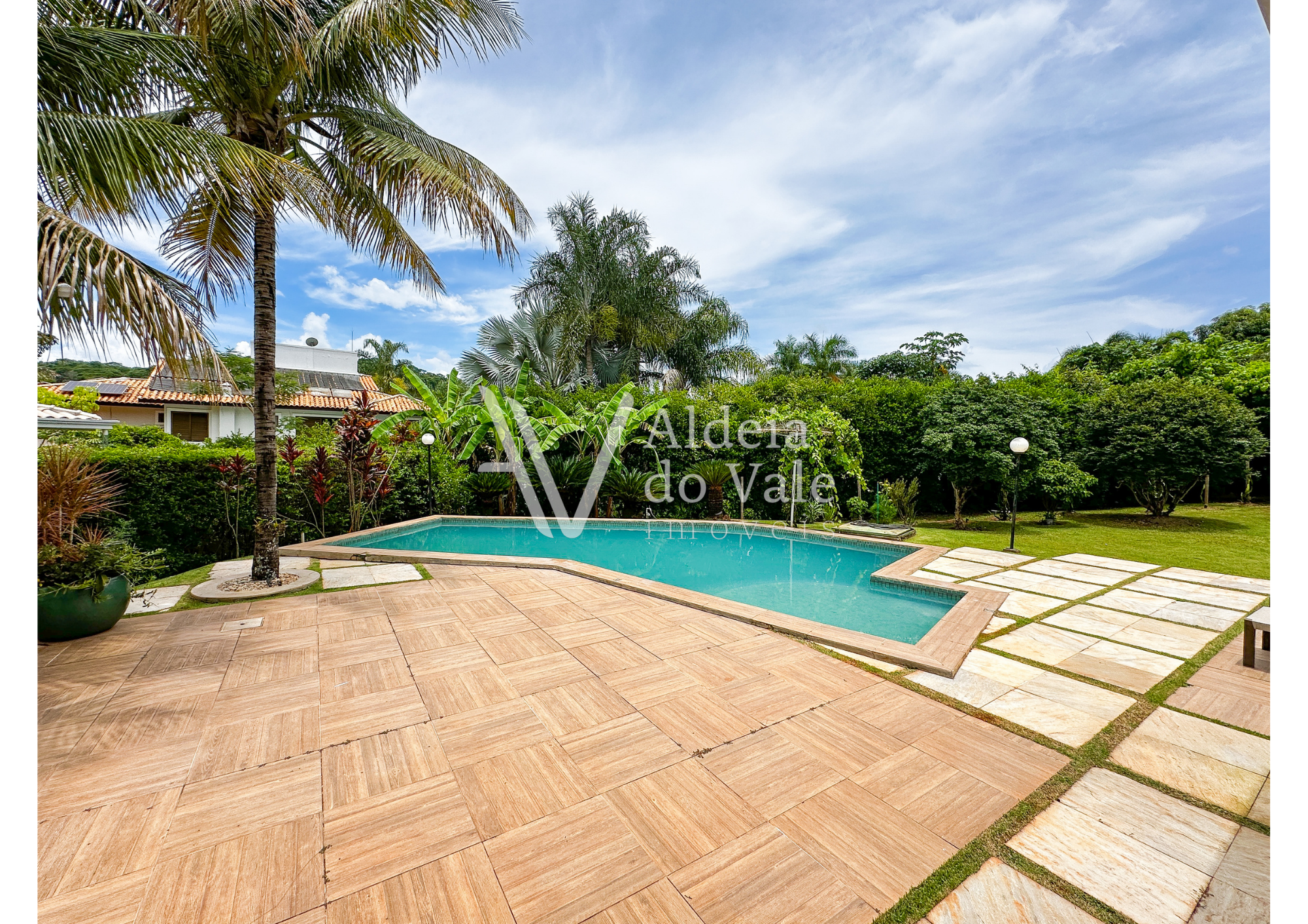 •Piscina cercada por um jardim encantador;