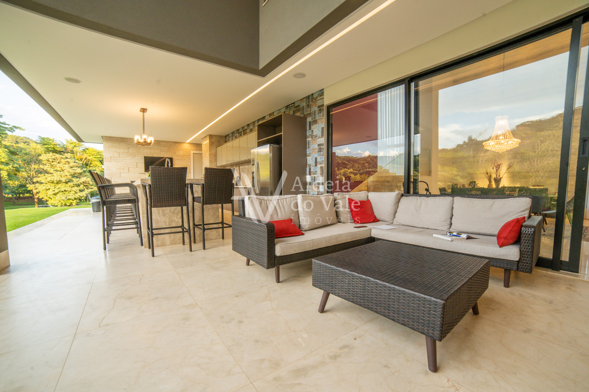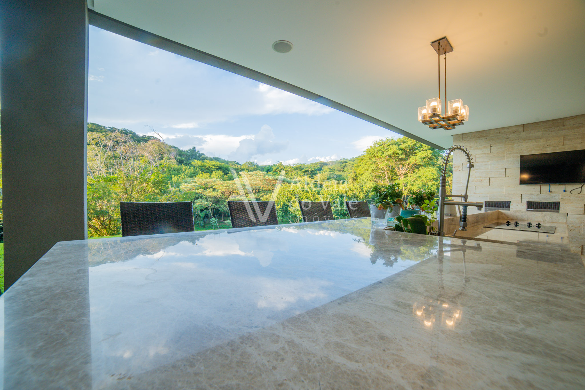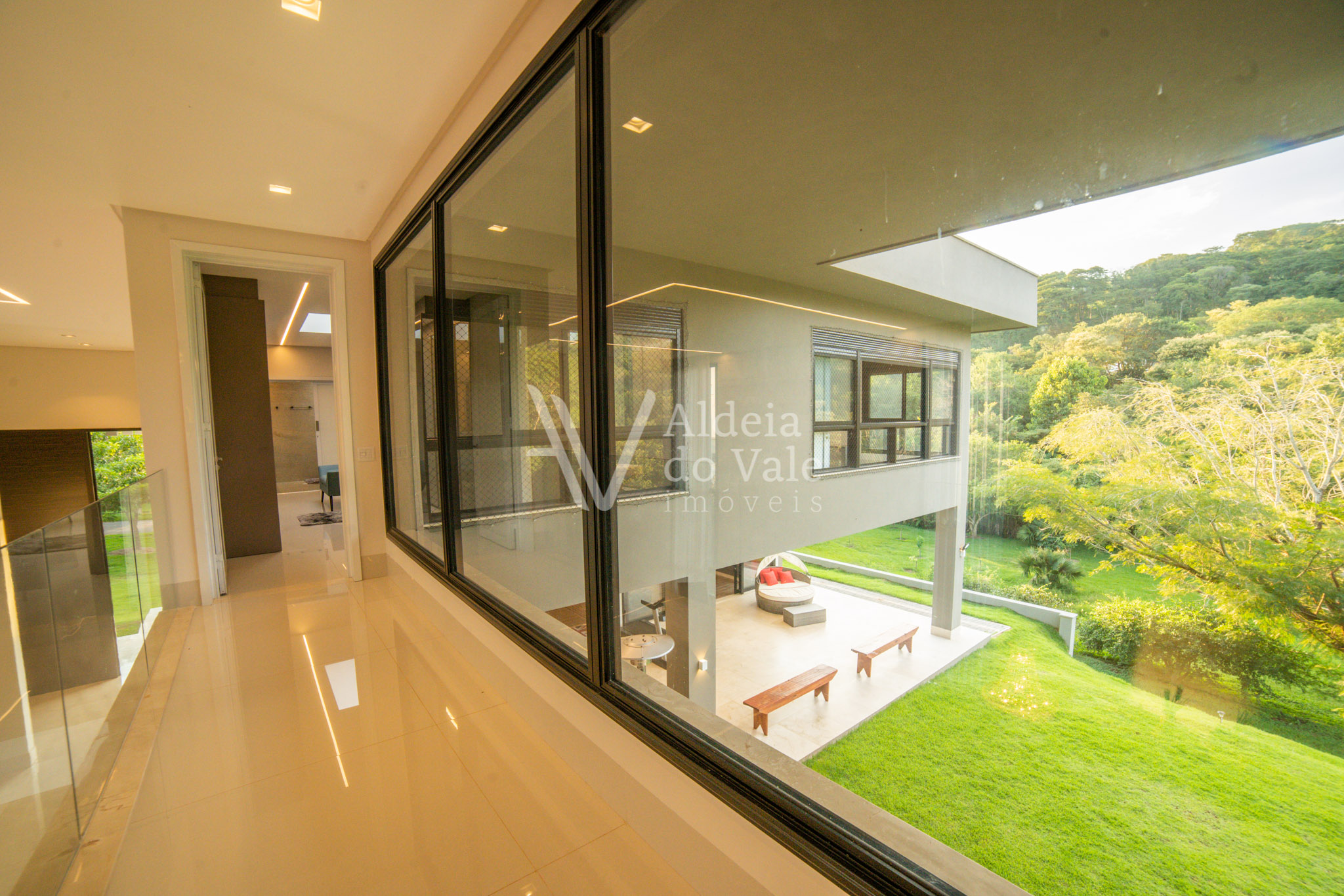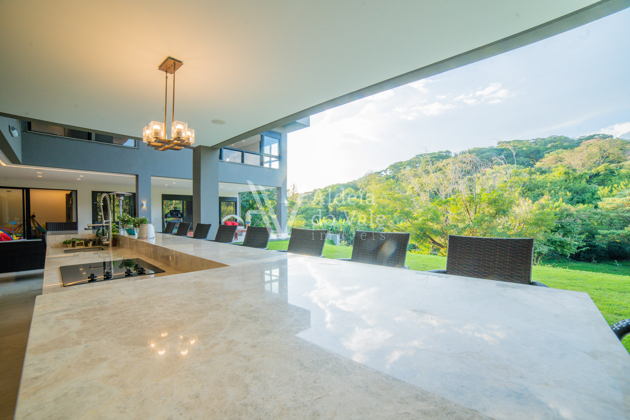 Edificada no meio da natureza, olho por todas as janelas e avisto o verde, é tanto espaço, tanta amplidão, com o complemento de um acolhimento total do vale ao redor. Pensar em todos os momentos maravilhosos que posso ter aqui é um filme contínuo e sem fim… chegar em casa e relaxar tomando um champagne à noite vendo o luar, dentro da banheira maravilhosa no meu recanto particular… cozinhar com os amigos na cozinha gourmet  envolta pela beleza da natureza, com privacidade total, estou em um lugar especial.