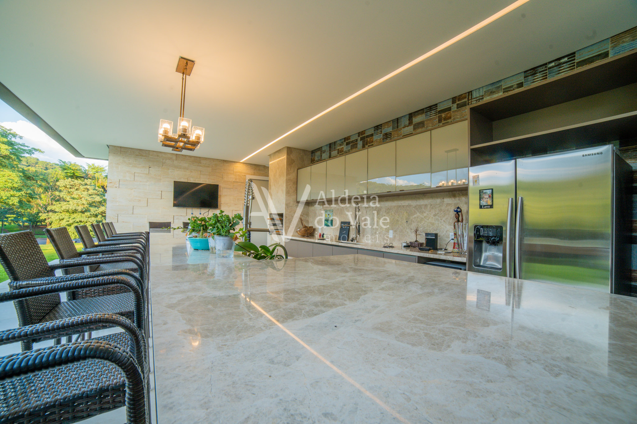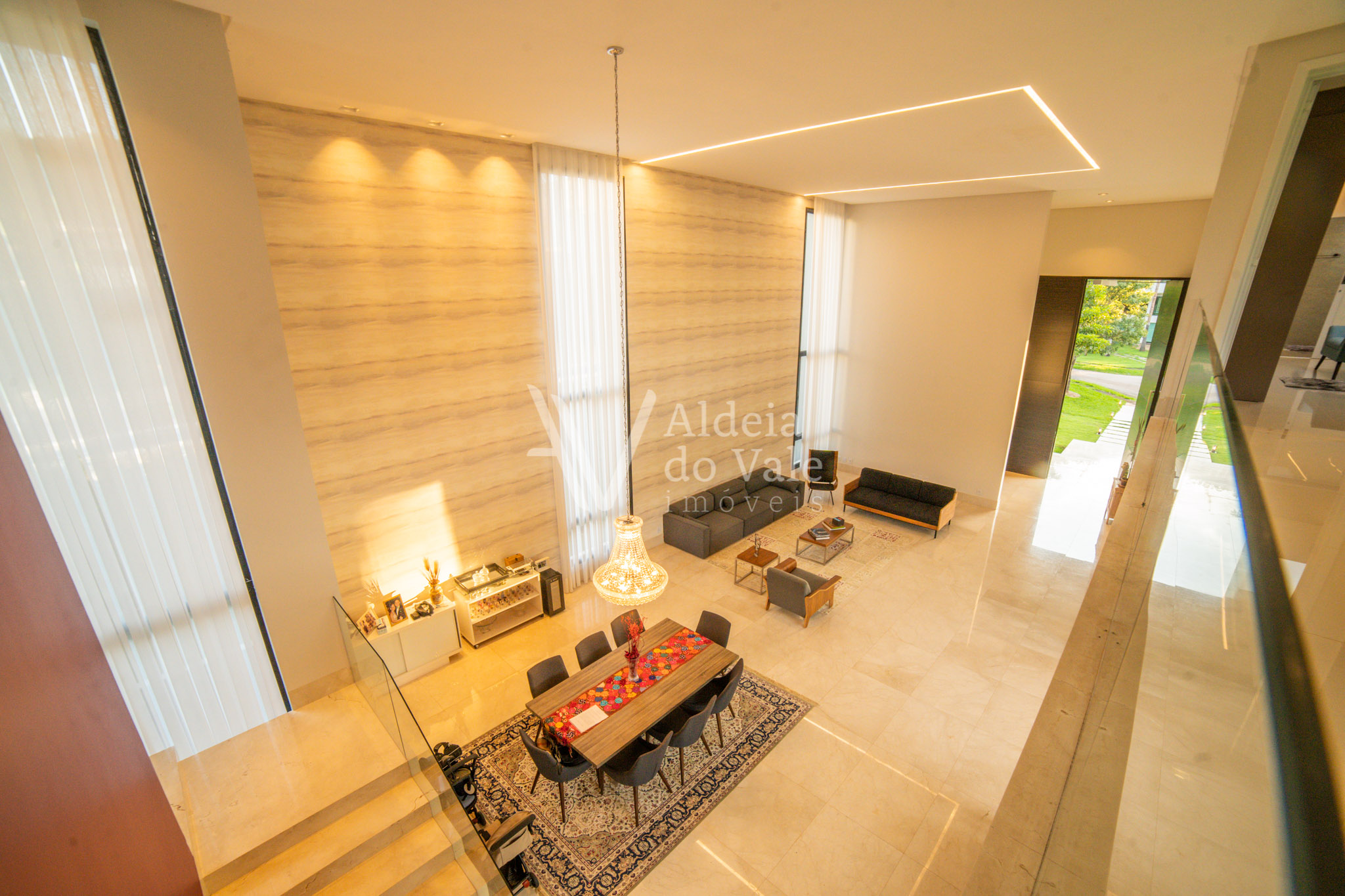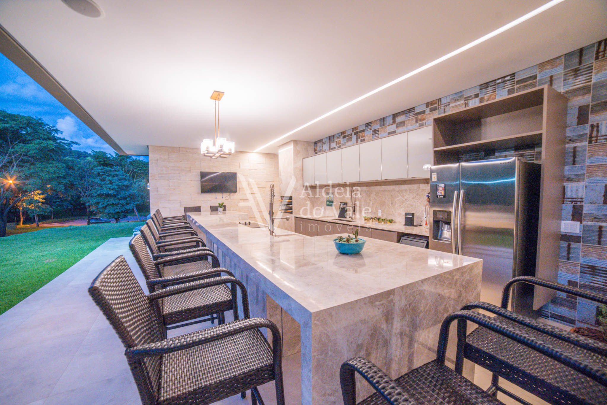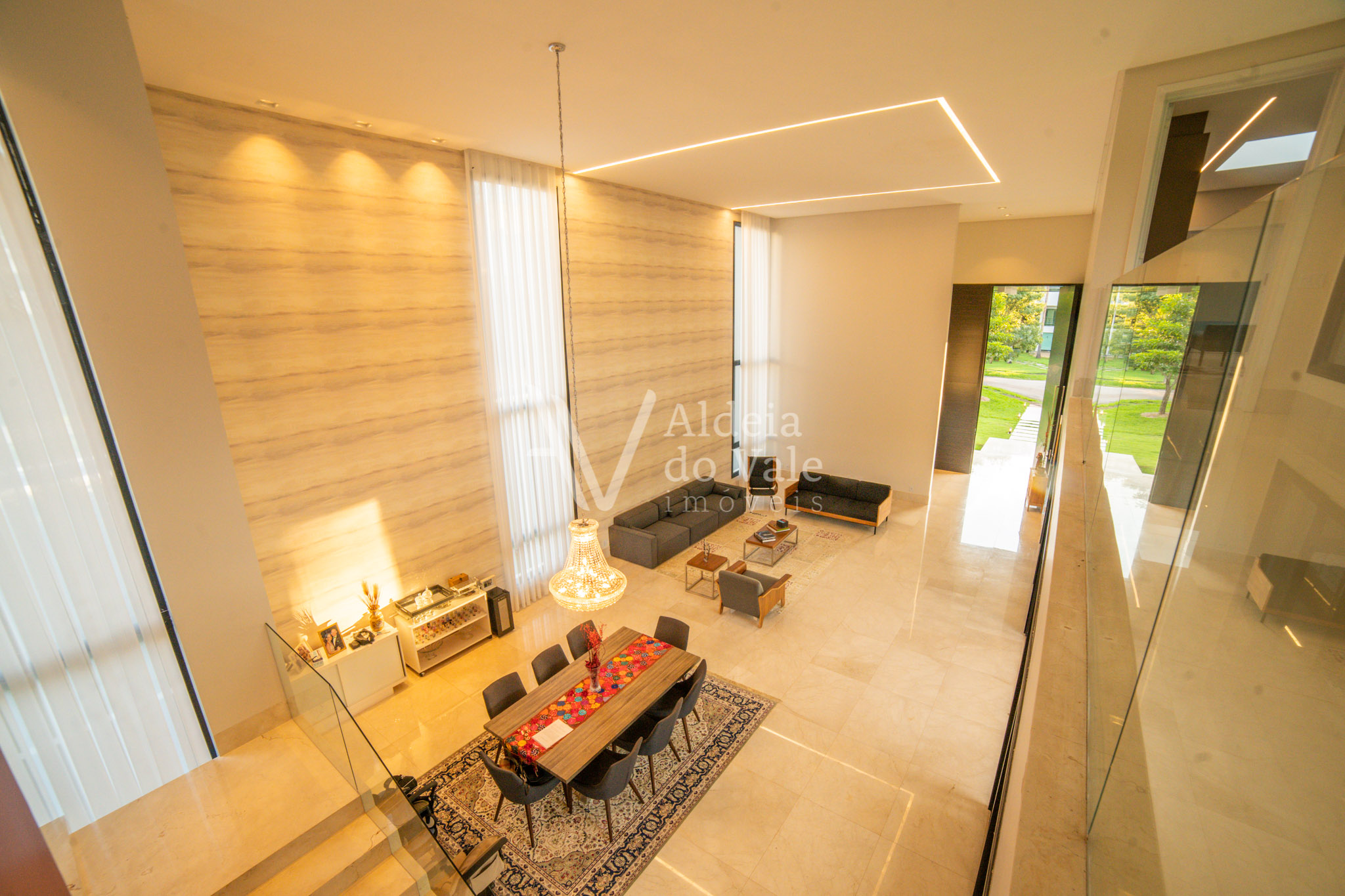 No piso térreo são 2 suítes maravilhosas, escritório, Home Theater, um PUB, brinquedoteca, varanda de 143m2 com piso no mármore e um lindo espaço gourmet com churrasqueira, bancada de 6 mts em mármore travertino, dois banheiros com ducha, cozinha, despensa.