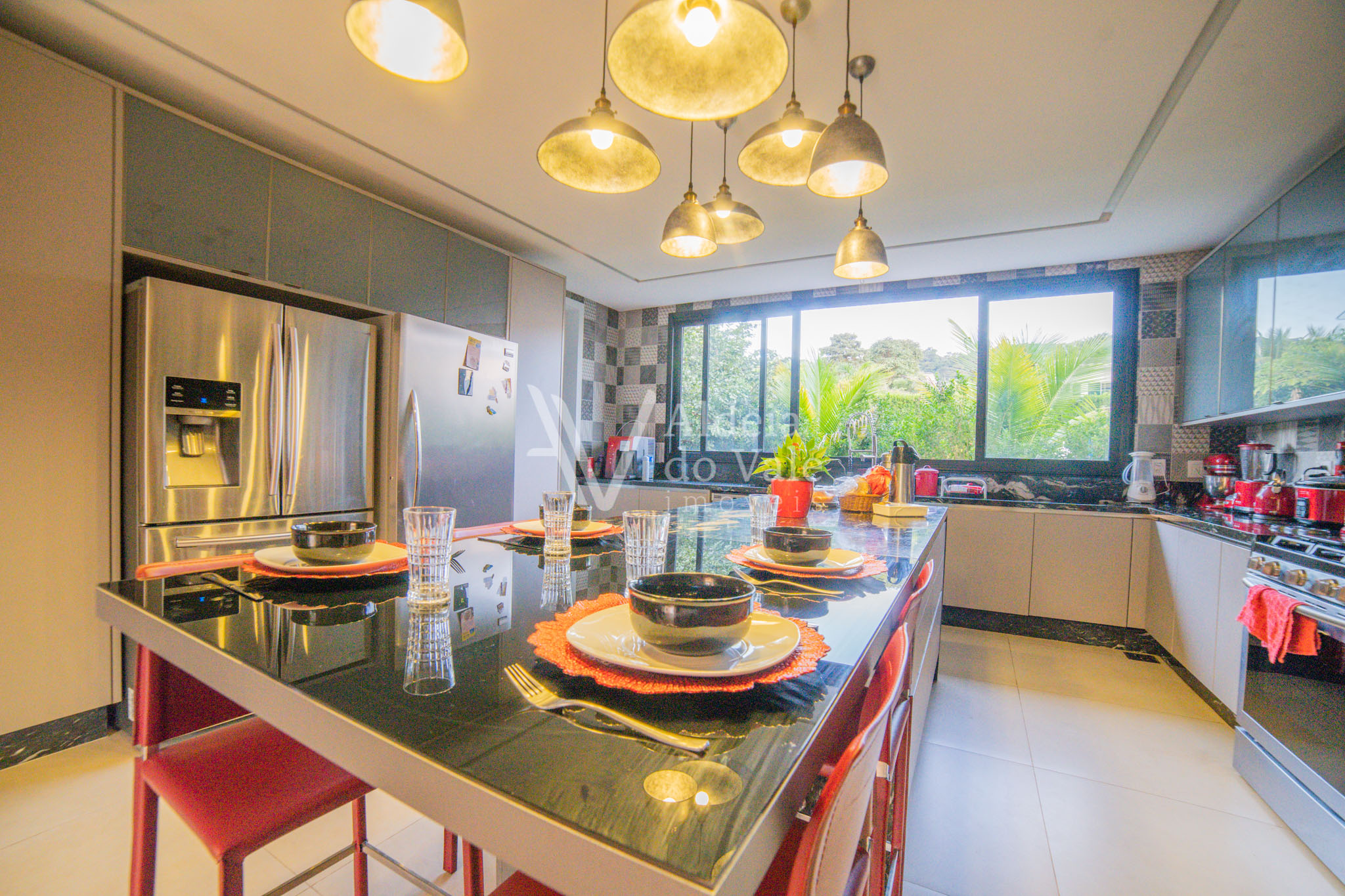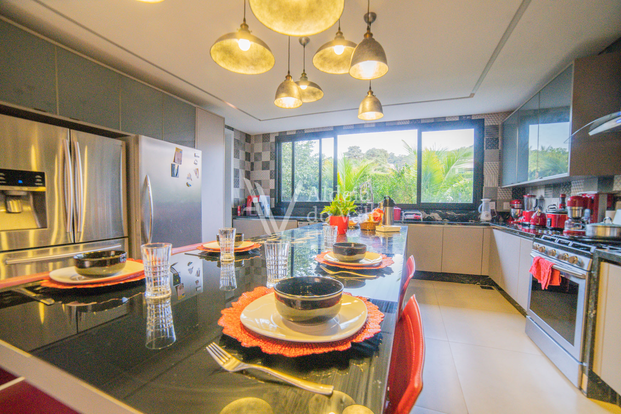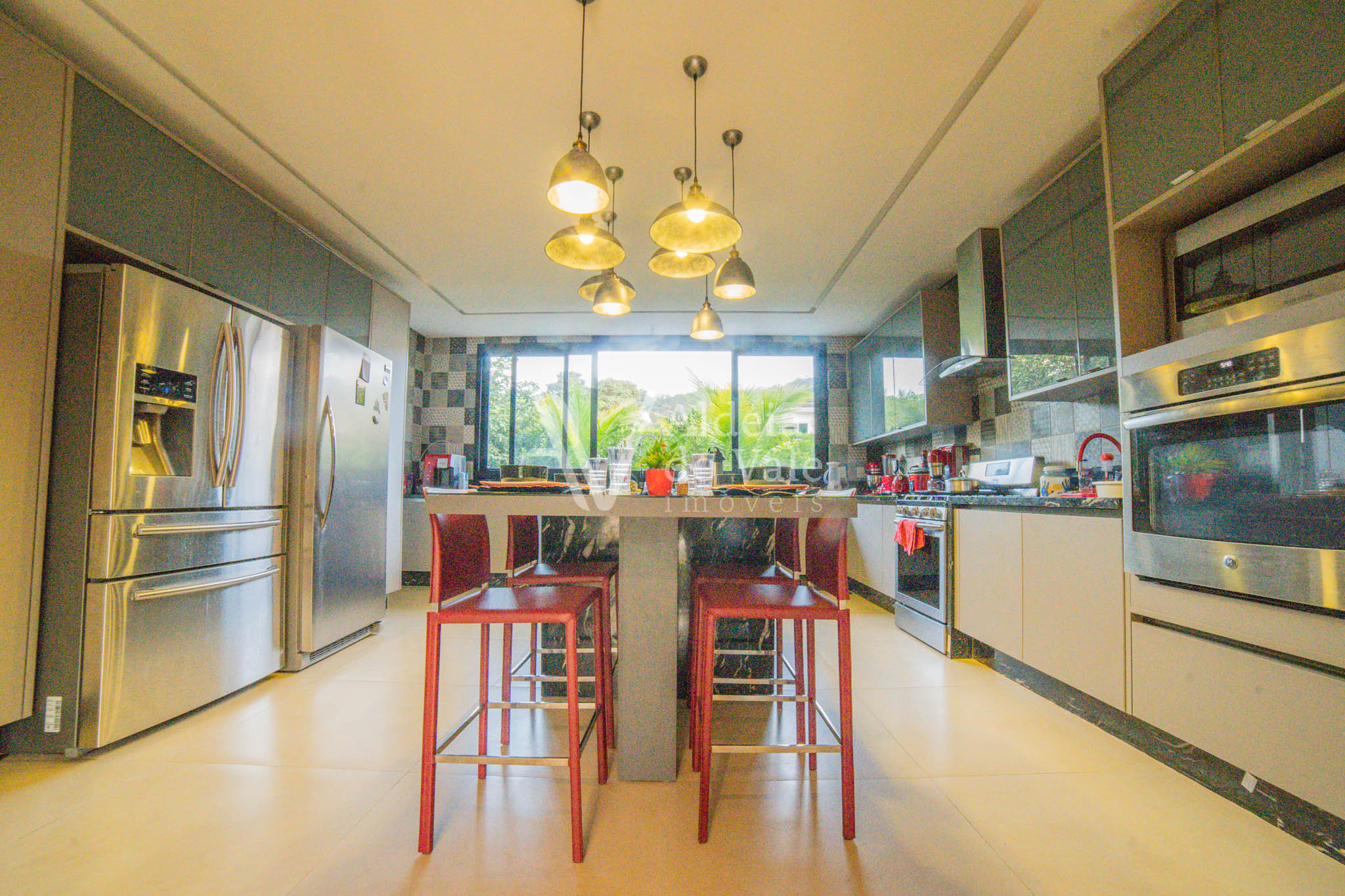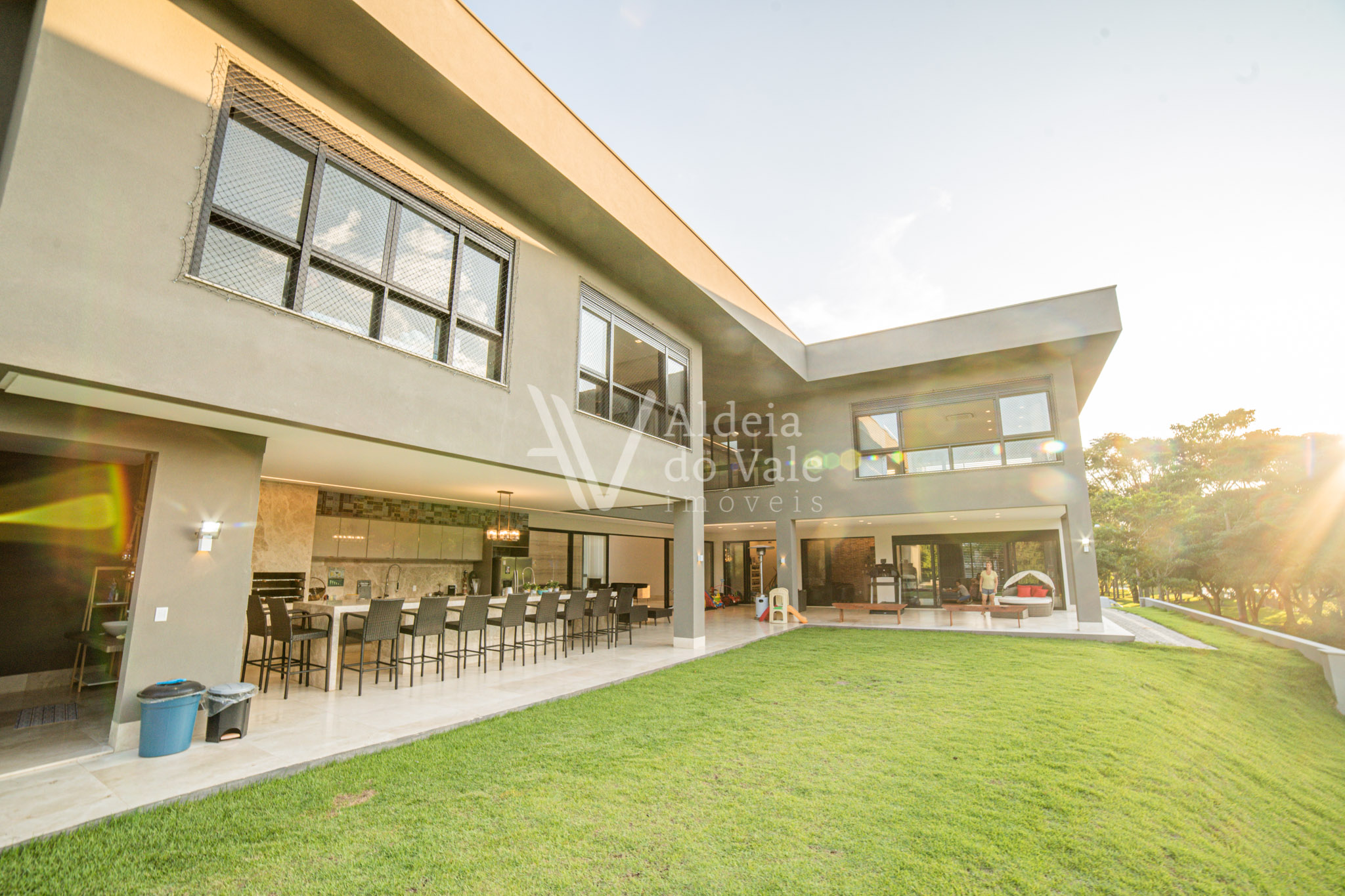 No piso térreo são 2 suítes maravilhosas, escritório, Home Theater, um PUB, brinquedoteca, varanda de 143m2 com piso no mármore e um lindo espaço gourmet com churrasqueira, bancada de 6 mts em mármore travertino, dois banheiros com ducha, cozinha, despensa.