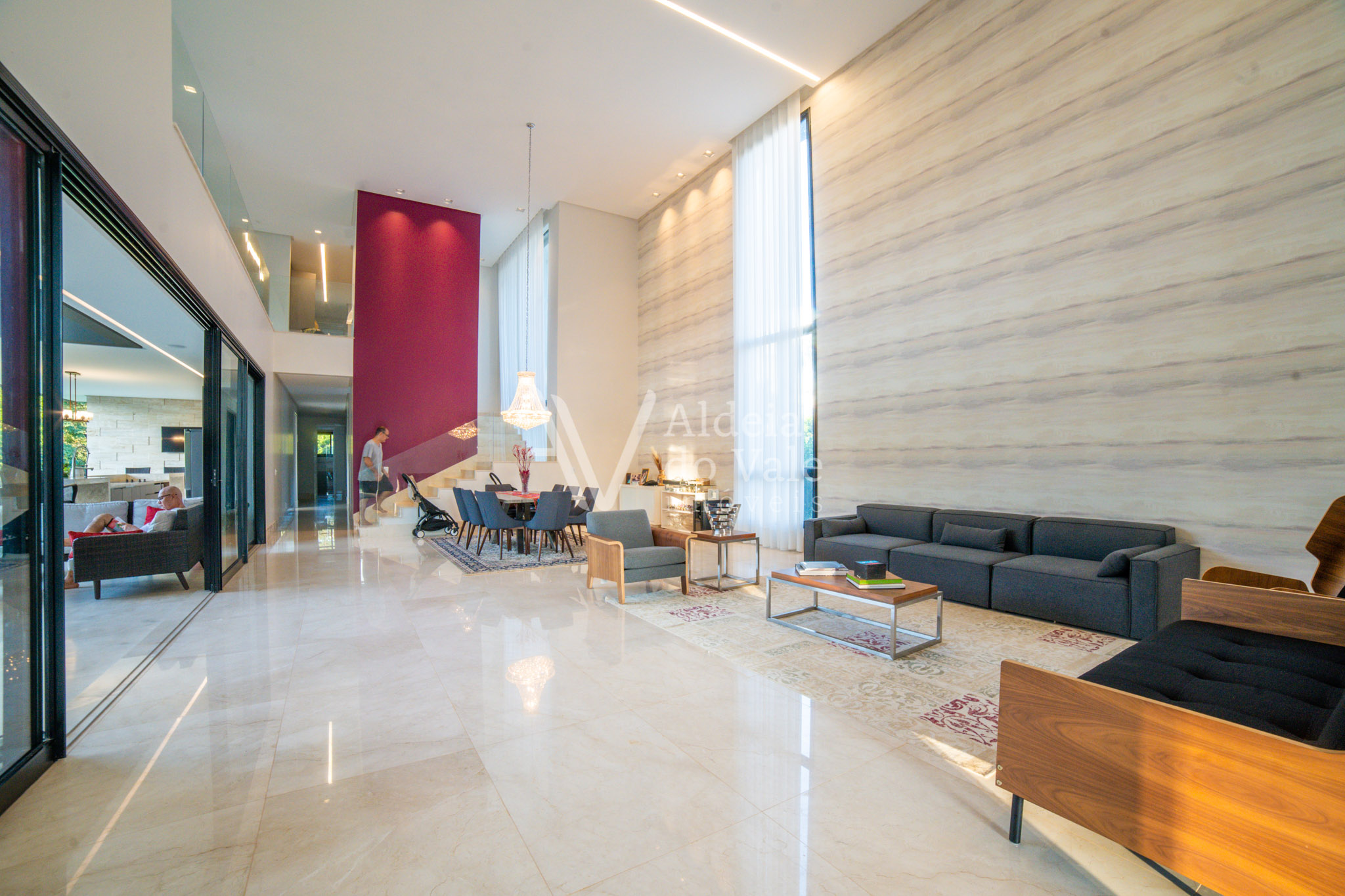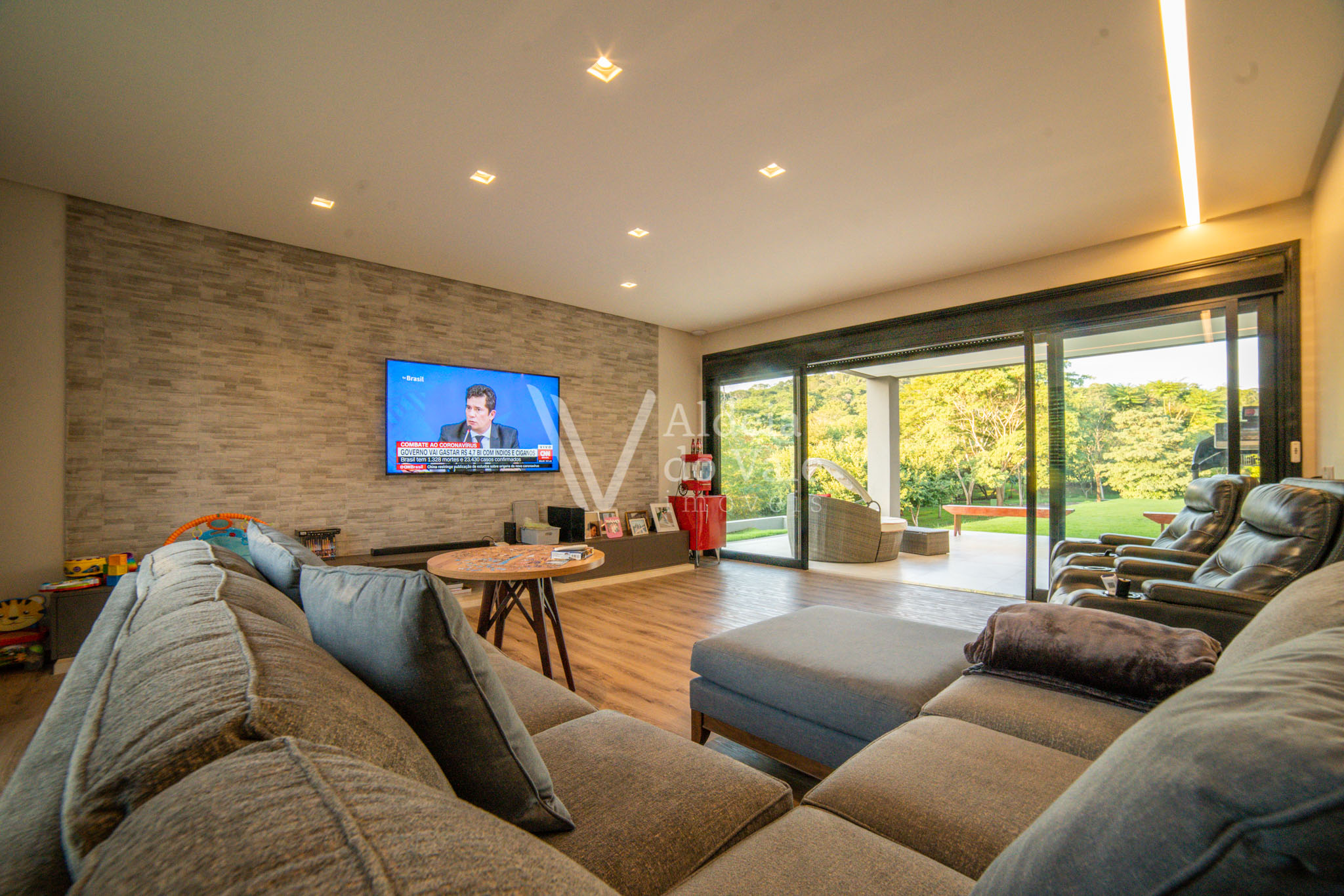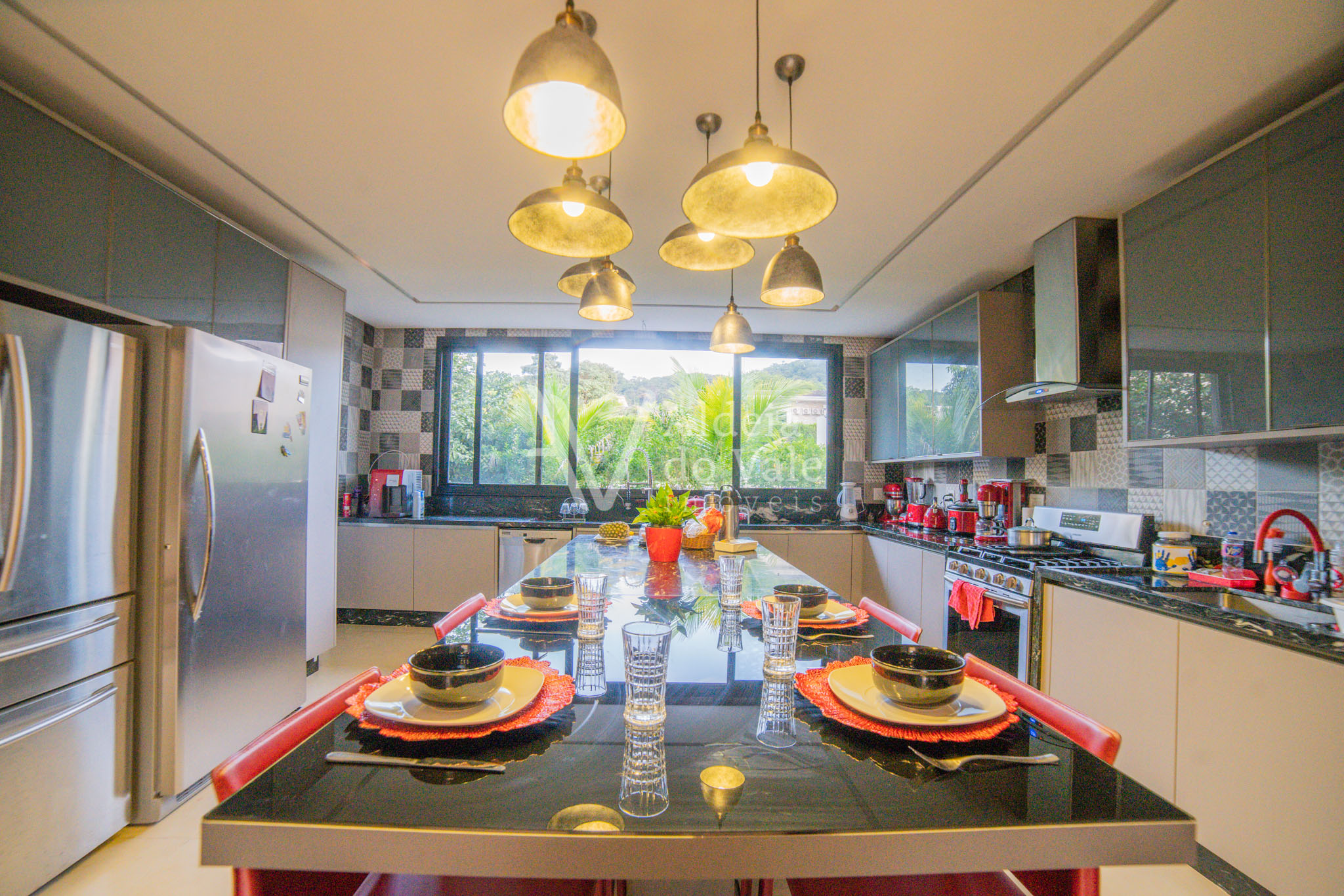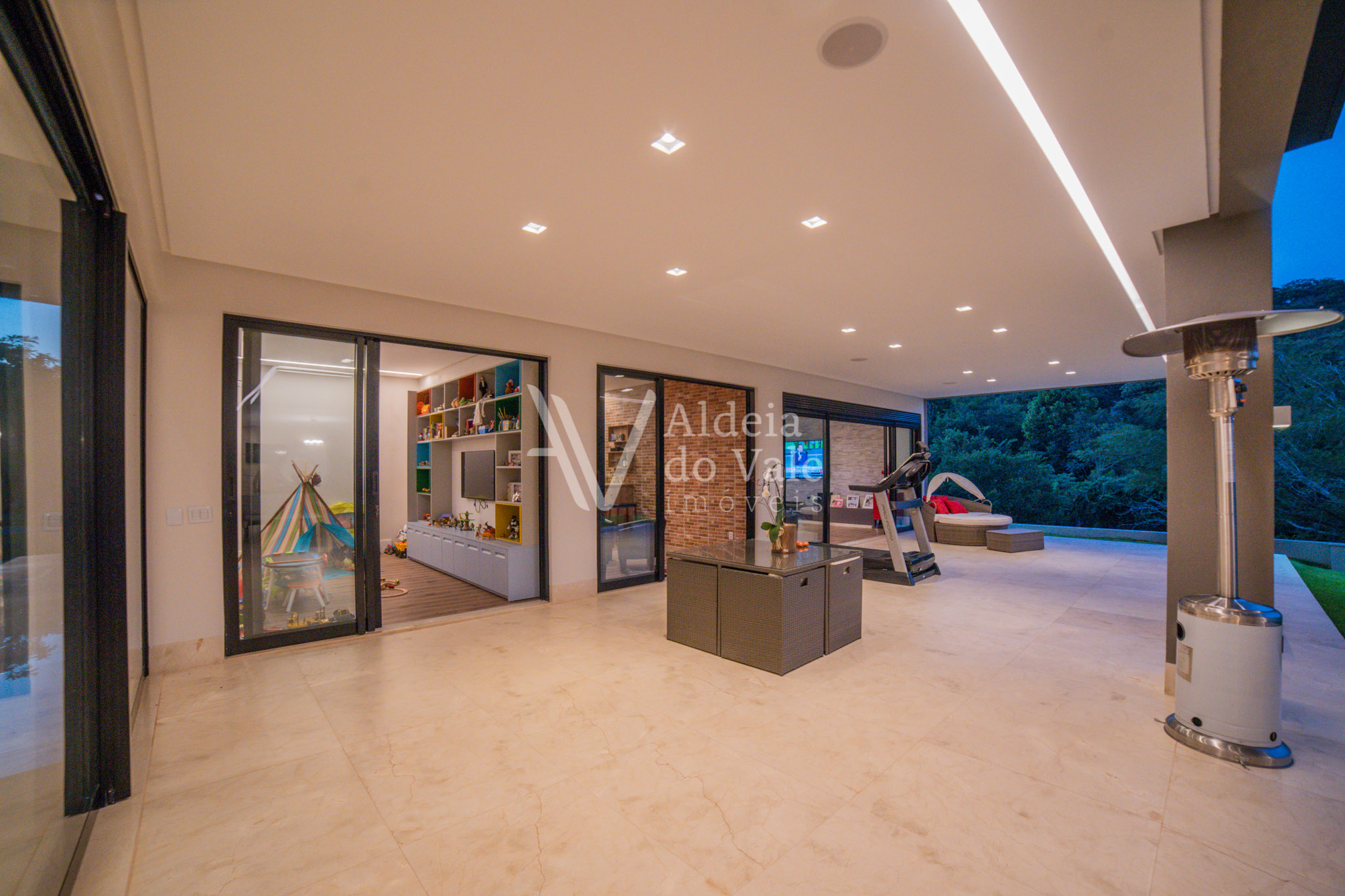 No piso térreo são 2 suítes maravilhosas, escritório, Home Theater, um PUB, brinquedoteca, varanda de 143m2 com piso no mármore e um lindo espaço gourmet com churrasqueira, bancada de 6 mts em mármore travertino, dois banheiros com ducha, cozinha, despensa.