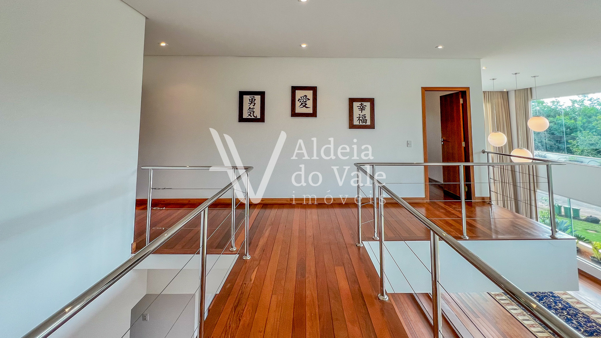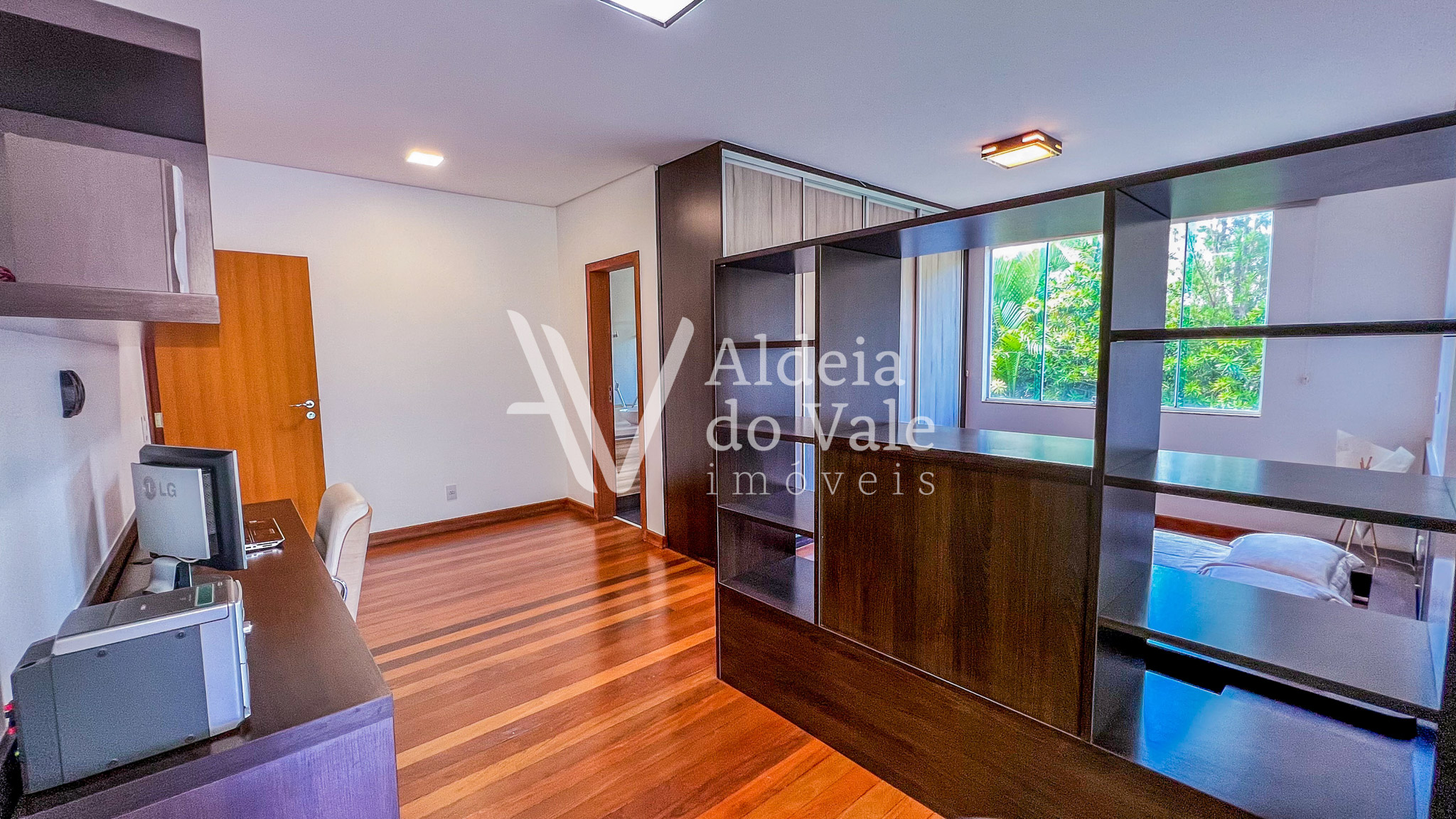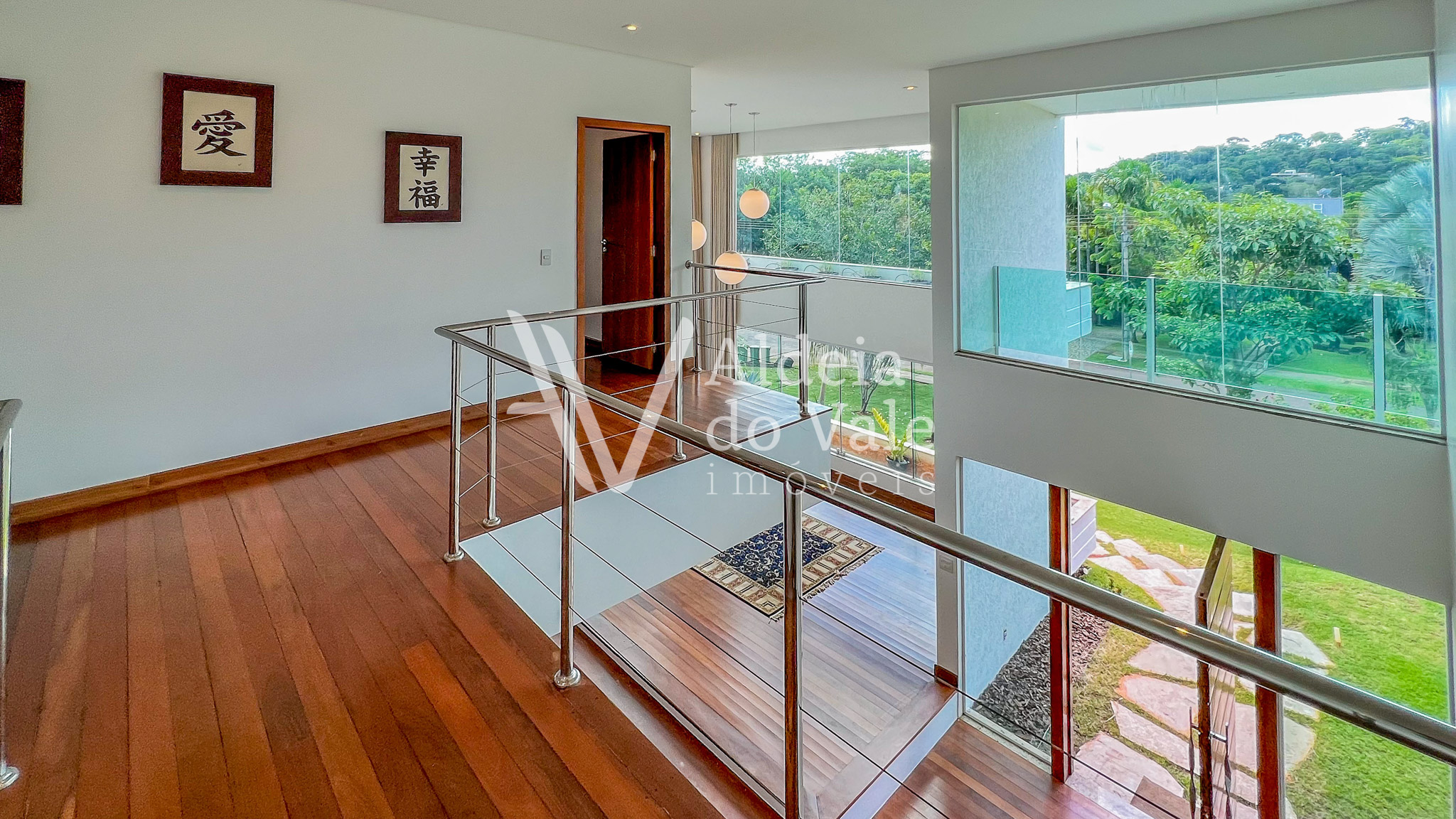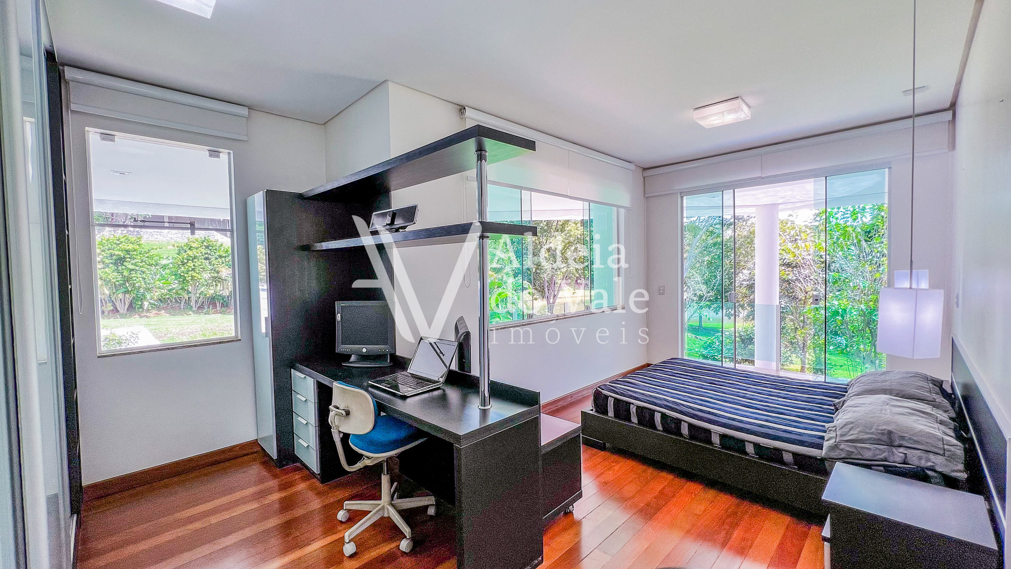 Todo o piso superior da casa é rico em varandas, o que proporciona uma vista ampla do terreno e do condomínio. Possui 5 suítes, sendo uma Master (com banheira e closet), duas suítes com ambiente de escritório, e uma suíte no andar térreo.