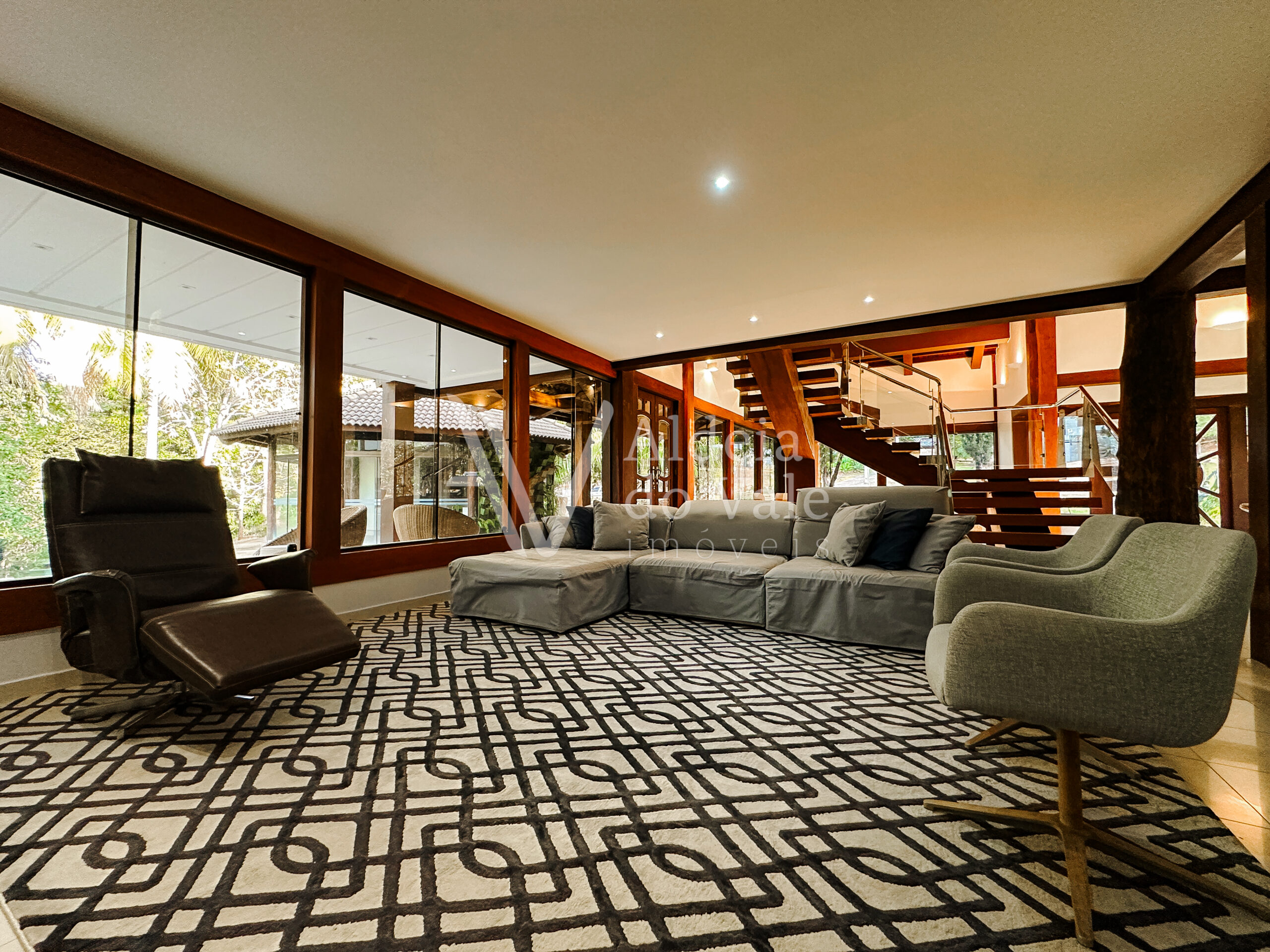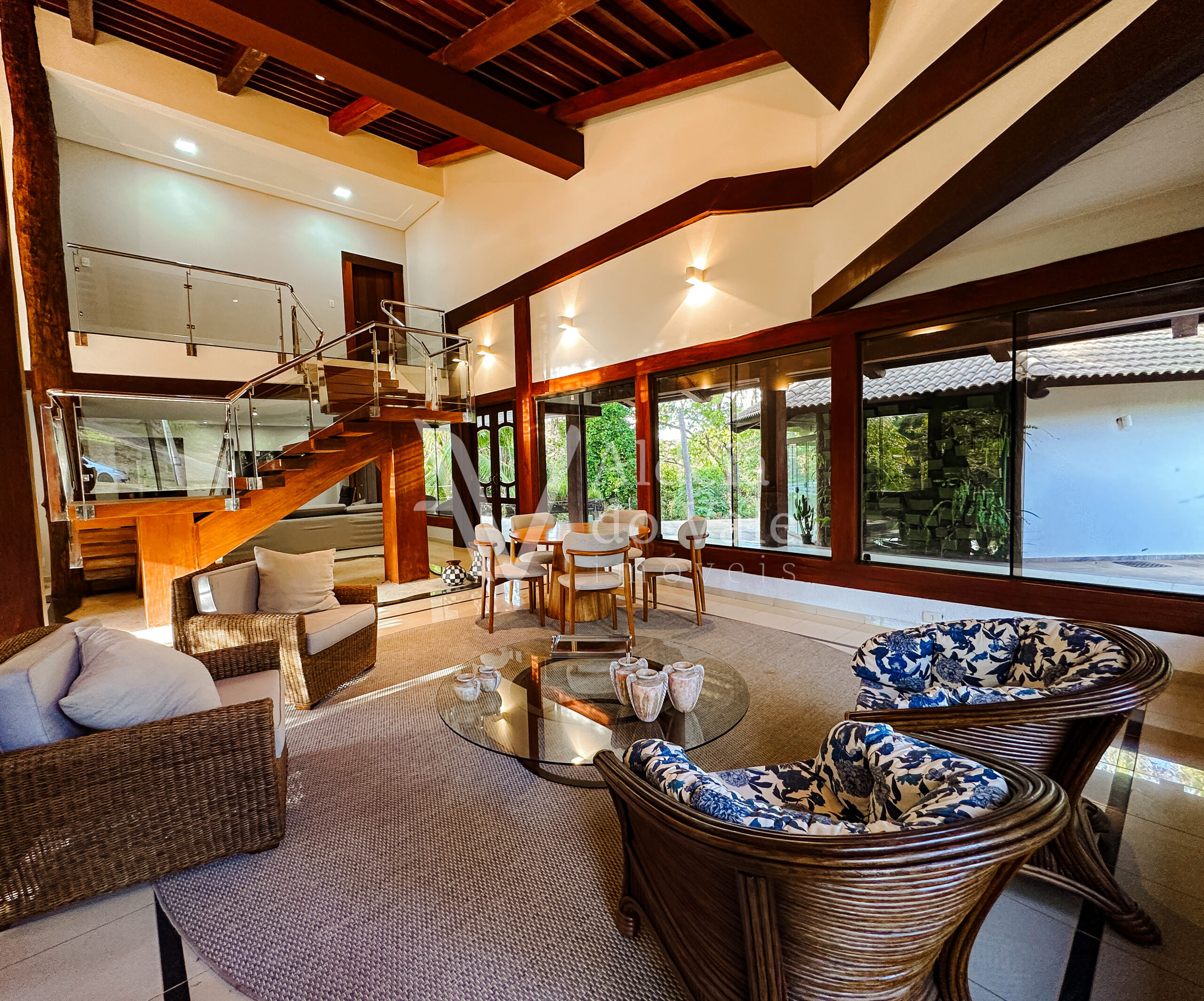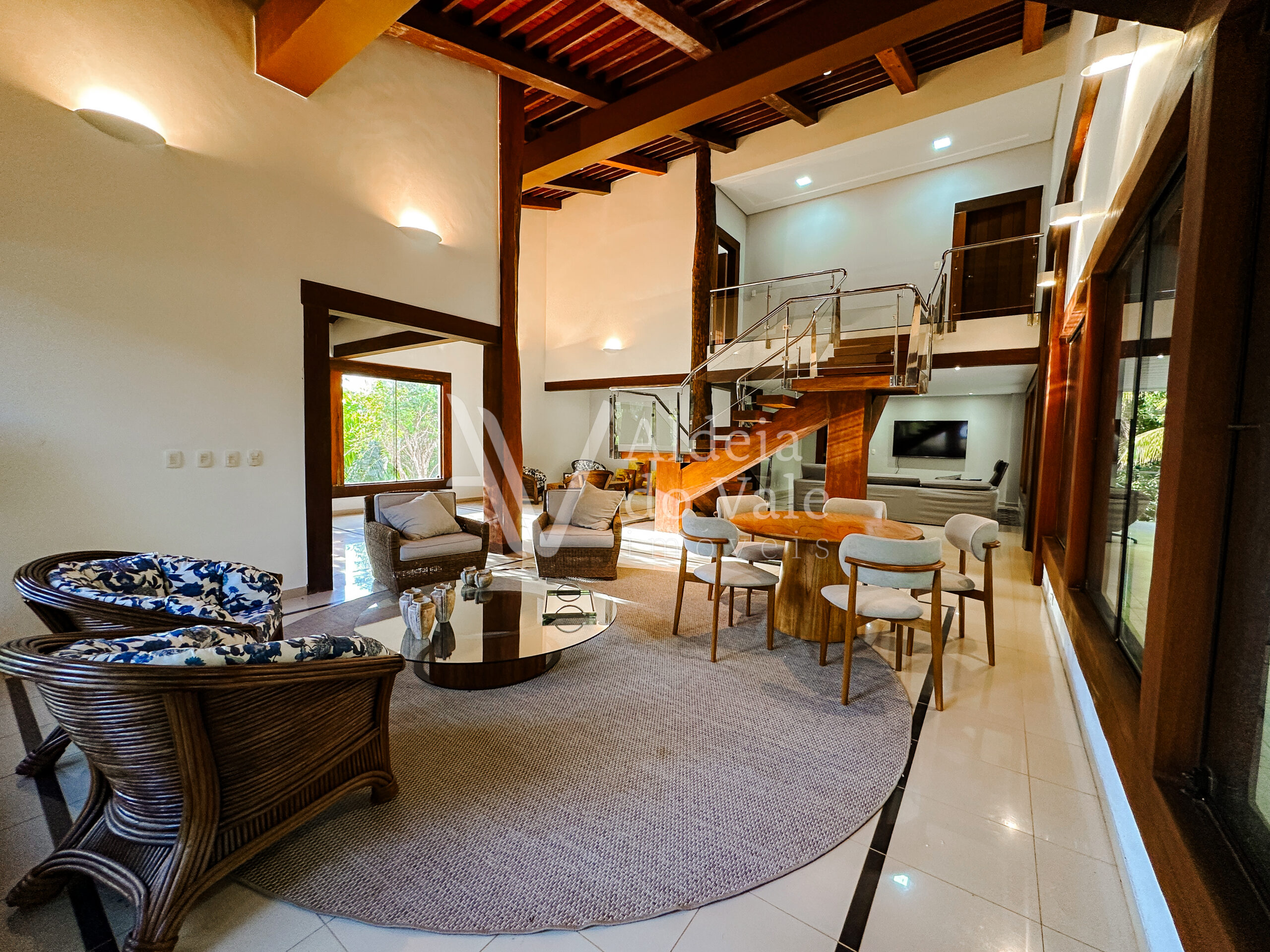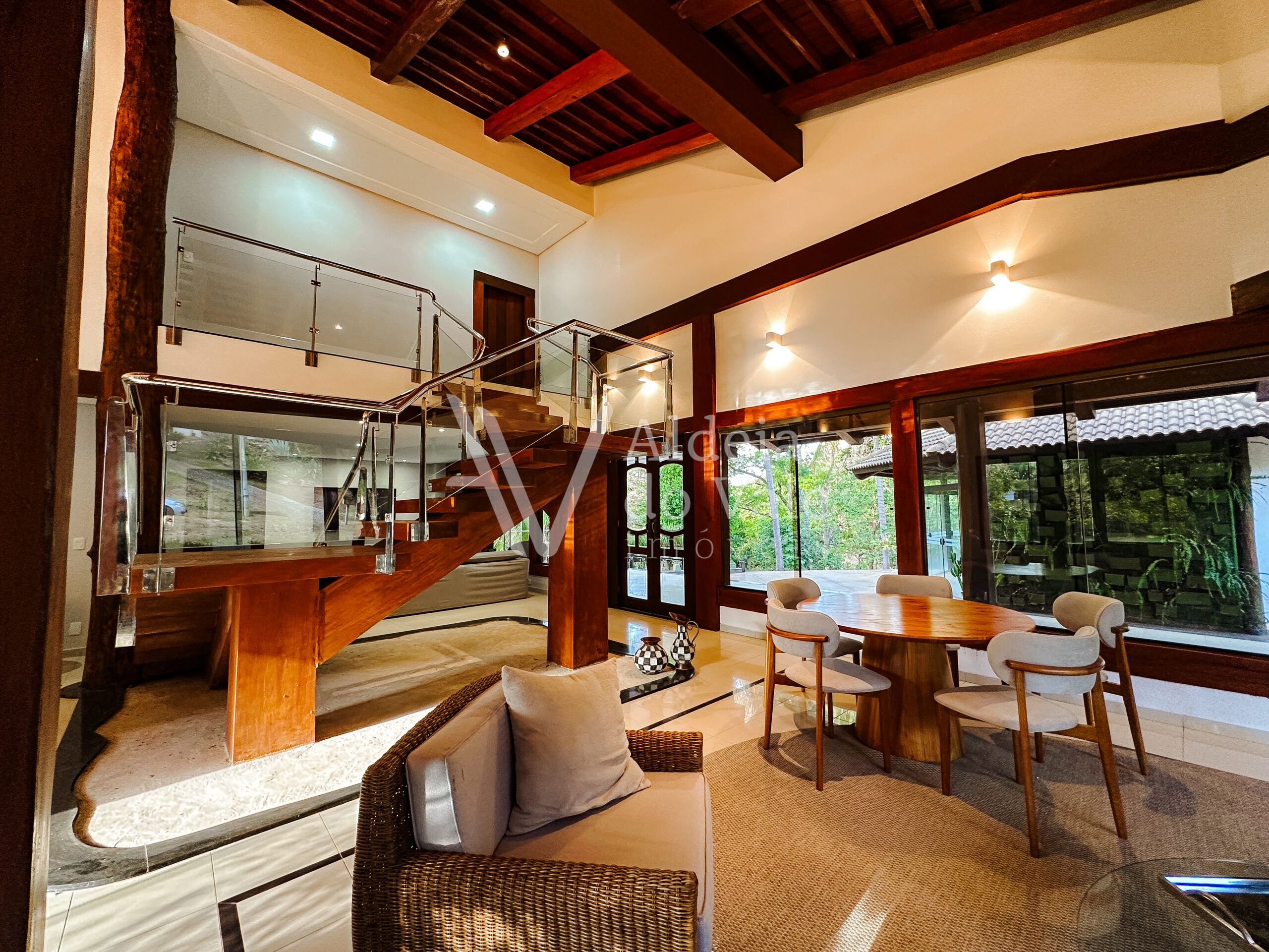 Com madeira, no estilo rústico, super aconchegante, possui uma sala lindíssima, muito bem iluminada, com pé-direito duplo.