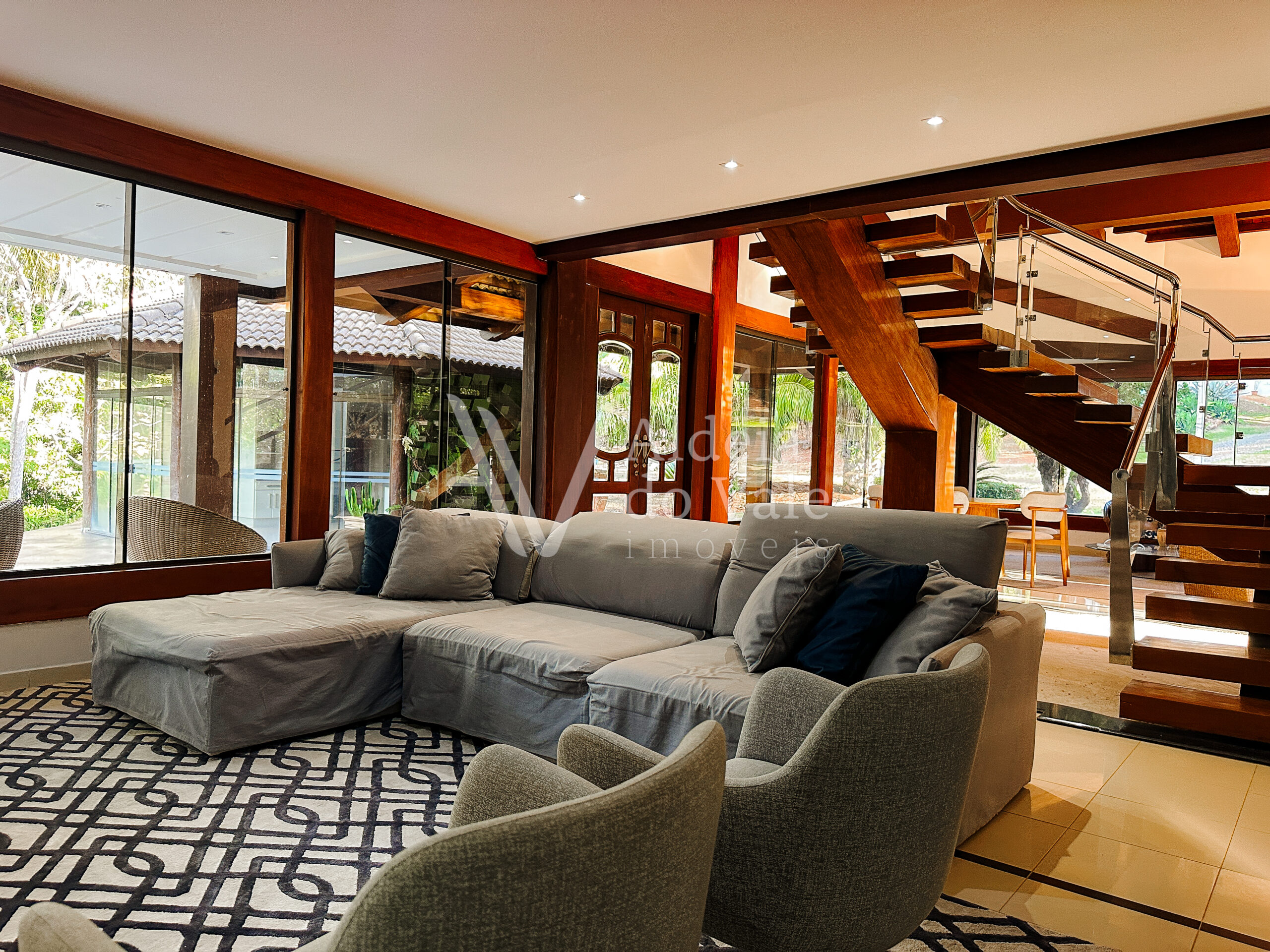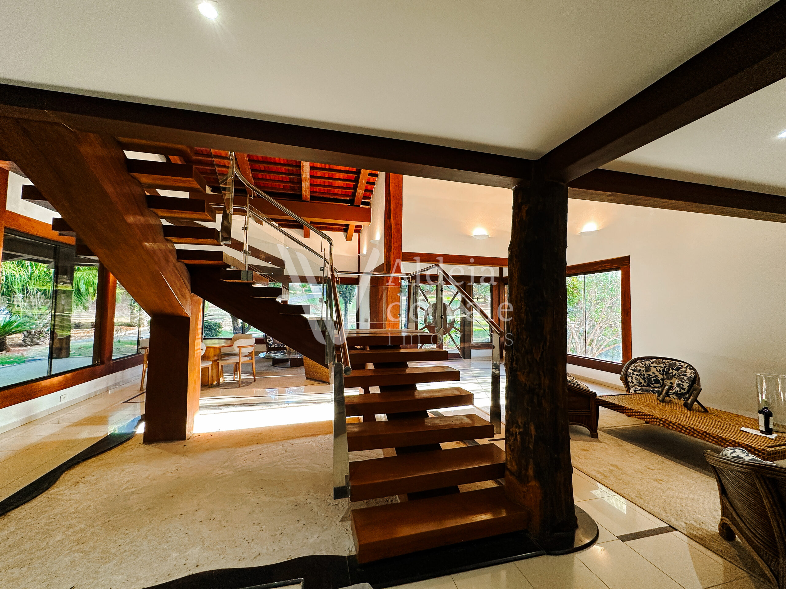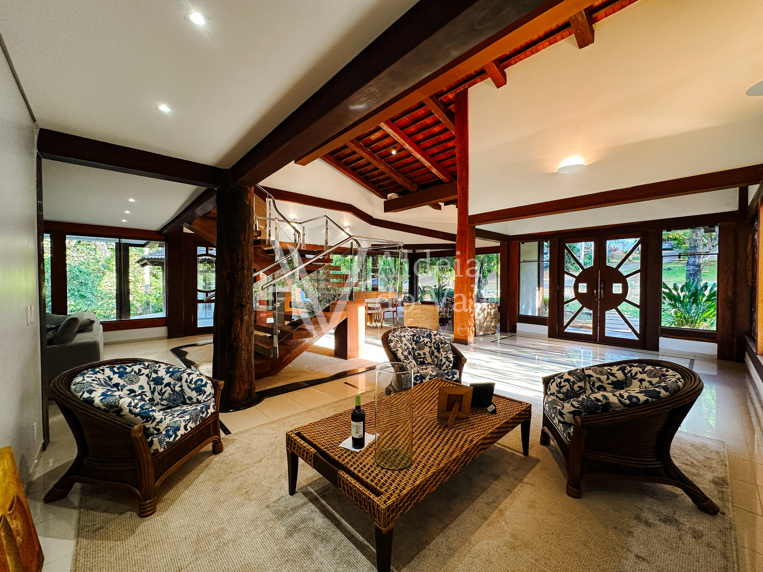 Com madeira, no estilo rústico, super aconchegante, possui uma sala lindíssima, muito bem iluminada, com pé-direito duplo.